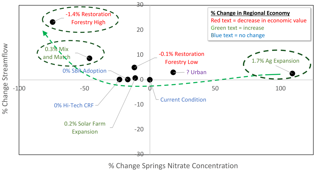 The scenarios should not be interpreted as specific recommendations for management or predictions for the future. They were designed by the PMP stakeholders and modelers collaboratively to explore the response of the system to various types of interventions. In some cases, the scenarios are designed to reflect “extreme” conditions that would never be realistically implemented, but nevertheless help to understand the limits or “bookends” of a system’s response to various conditions. Other scenarios were designed to be more realistic in terms of possible future land use change, management intervention, or climate variation.