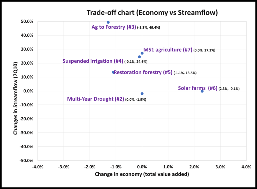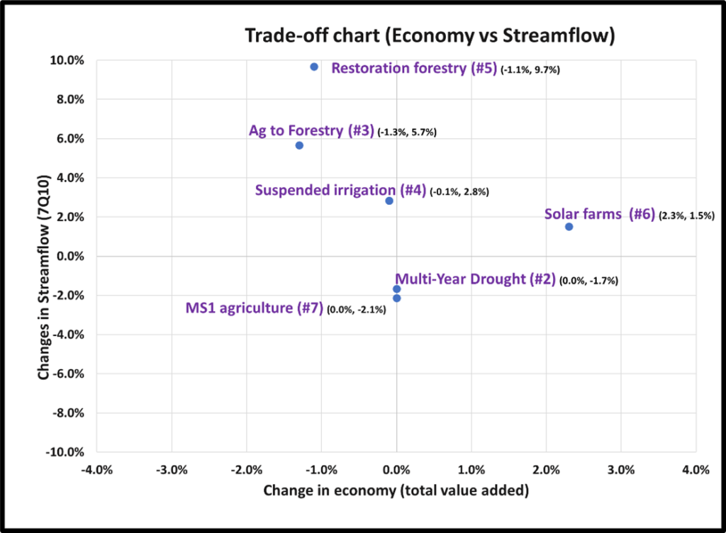 Economic impacts analyses were conducted using IMPLAN software to estimate the changes in the economic contributions of agriculture, forestry, and supporting industries in the study region for the alternative scenarios.